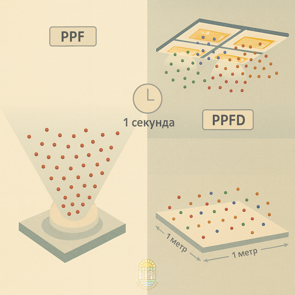 Это подводит нас к параметру PPFD, о котором я рассказывал в предыдущей статье. По сути, он является приложением PPF к конкретной площади. Измеряется в микромолях на квадратный метр в секунду (ммоль/м2/сек). Следующее изображение наглядно демонстрирует разницу между этими двумя характеристиками.