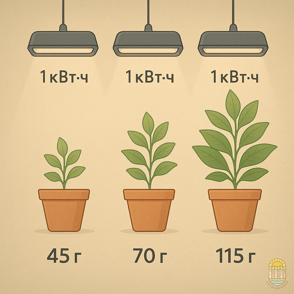 По какому признаку можно судить об успешности садоводческой деятельности? Как вариант, по количеству урожая. При прочих равных условиях, объём собранного продукта будет зависеть от яркости и качества фитосвета. Соотношение массы урожая к затраченной электроэнергии называется эффективностью роста. Это нерегламентированный параметр без специального обозначения.