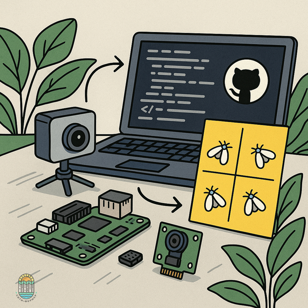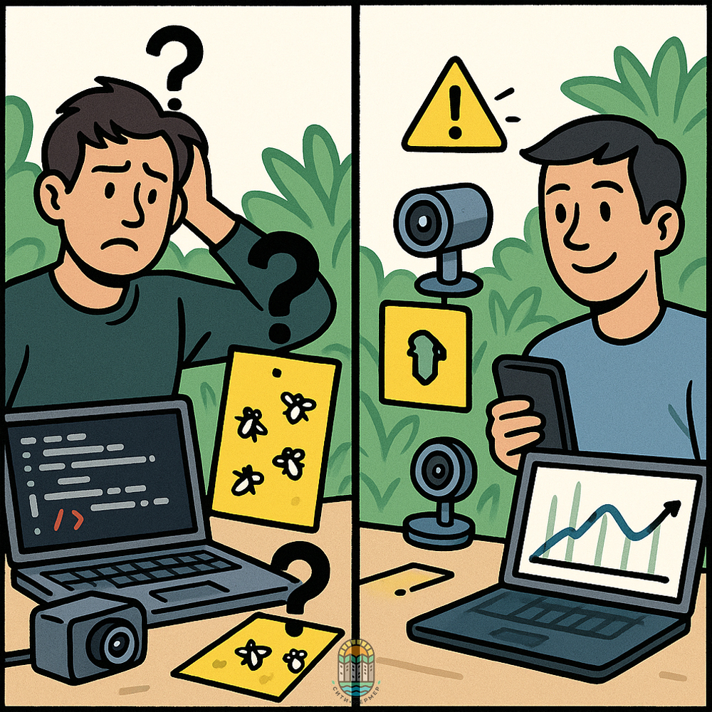 - Студенты и фермеры выкладывают на GitHub проекты, где Raspberry Pi + камера ежедневно делают снимки ловушек, а алгоритм подсчитывает белокрылку и строит график.