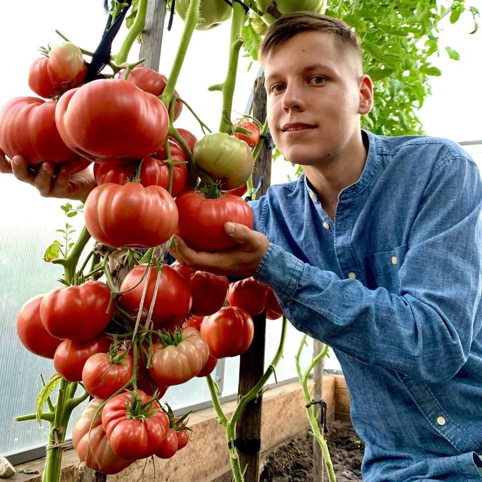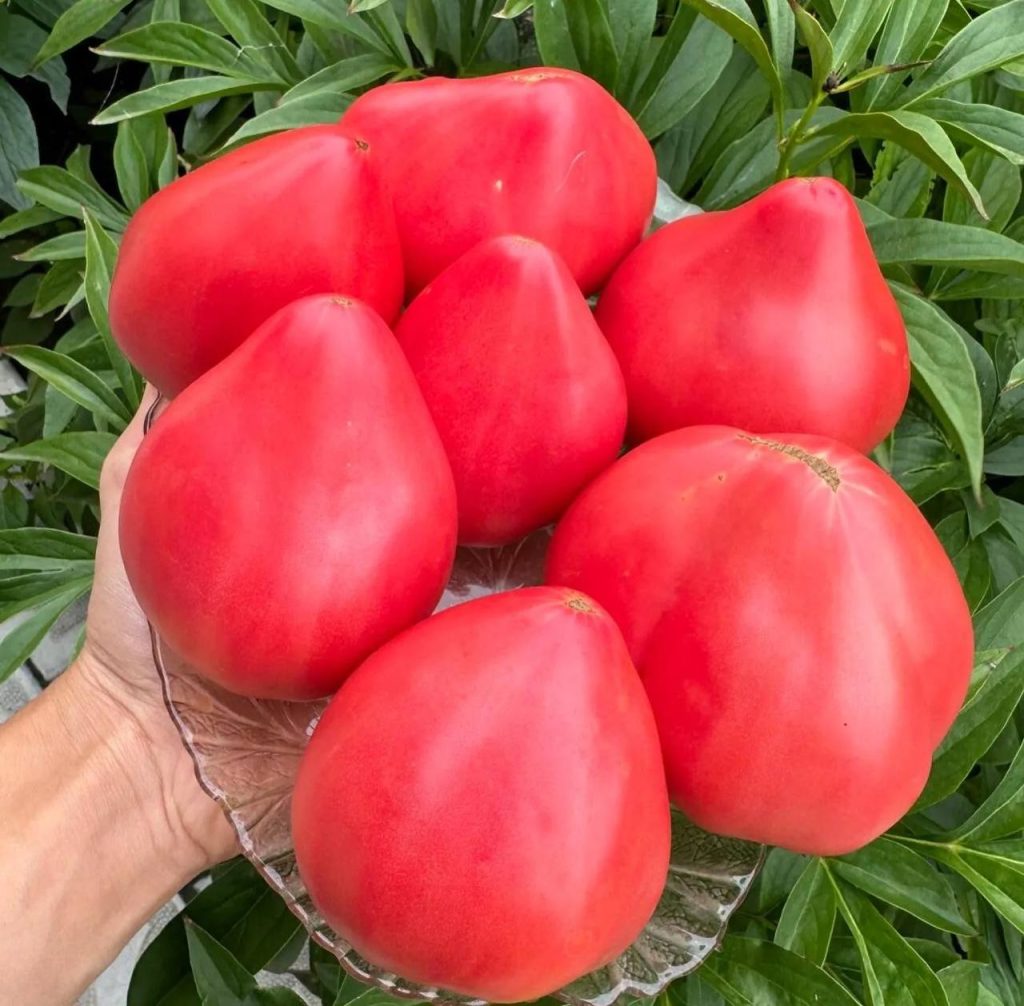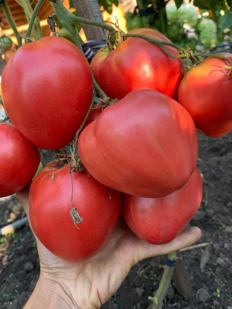 Невероятно урожайный индетерминантный сорт (до 1,8 метра) среднего срока созревания. Несмотря на изящное строение куста, он производит настоящие «бомбы» — крупные, вытянутые, иногда слегка приплюснутые плоды весом от 300 г до 1 кг и более. Кисти массивные, несущие до 10 завязей. Мякоть сахаристая и сочная. Сорт поражает своей стабильностью: даже в неблагоприятный сезон он завязывает огромное количество плодов, обеспечивая урожай до 8 кг с куста. Универсален в использовании. Рекомендуется ведение в 2–3 стебля.