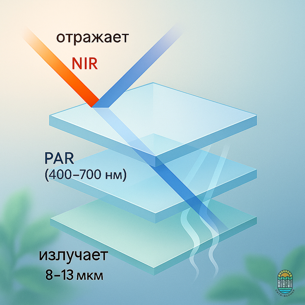 В регионах с высокой влажностью часть этого диапазона перекрывается водяным паром, и тепло уже не уходит так свободно. В таких условиях более важную роль играют фотоселективные компоненты, частично отражающие избыточное излучение.