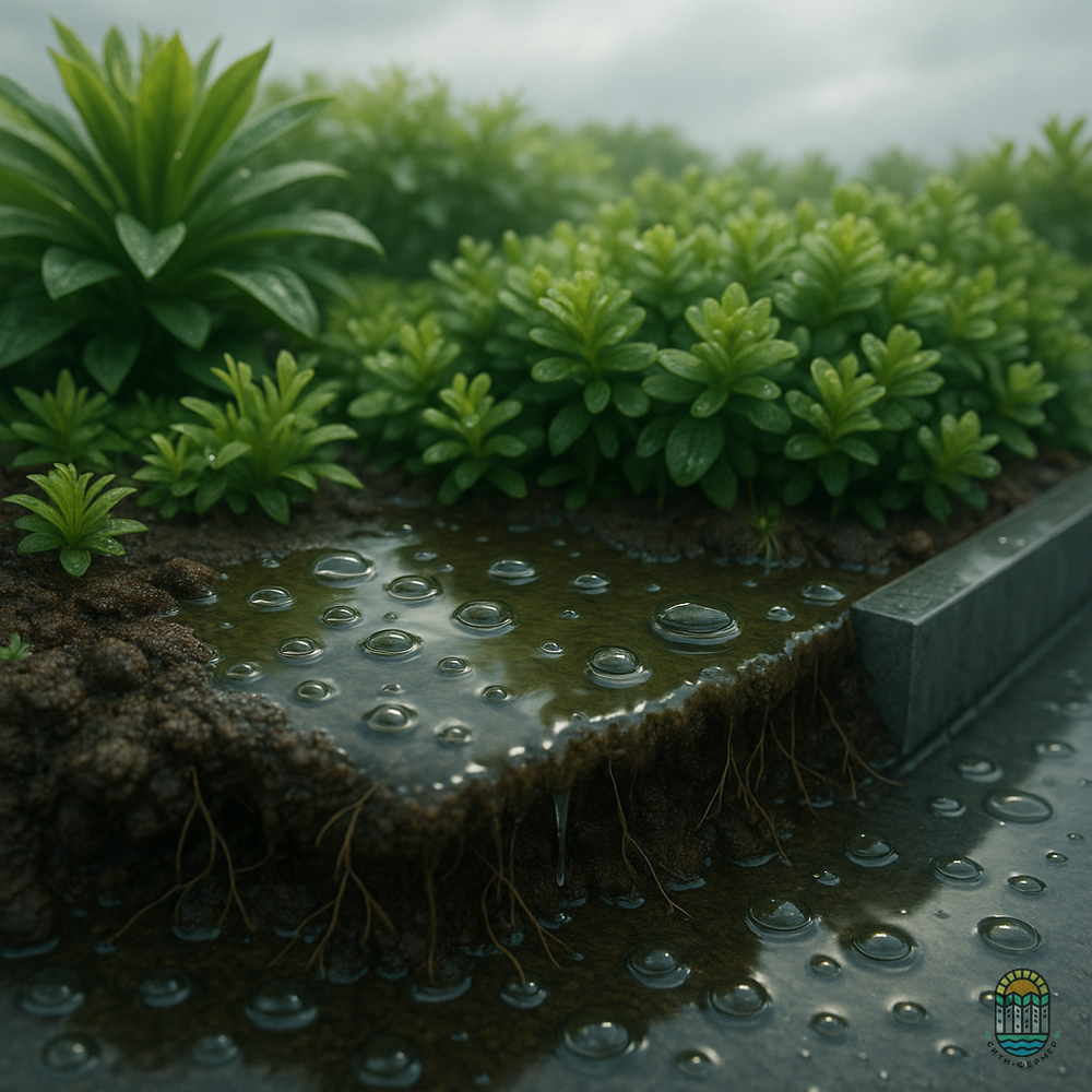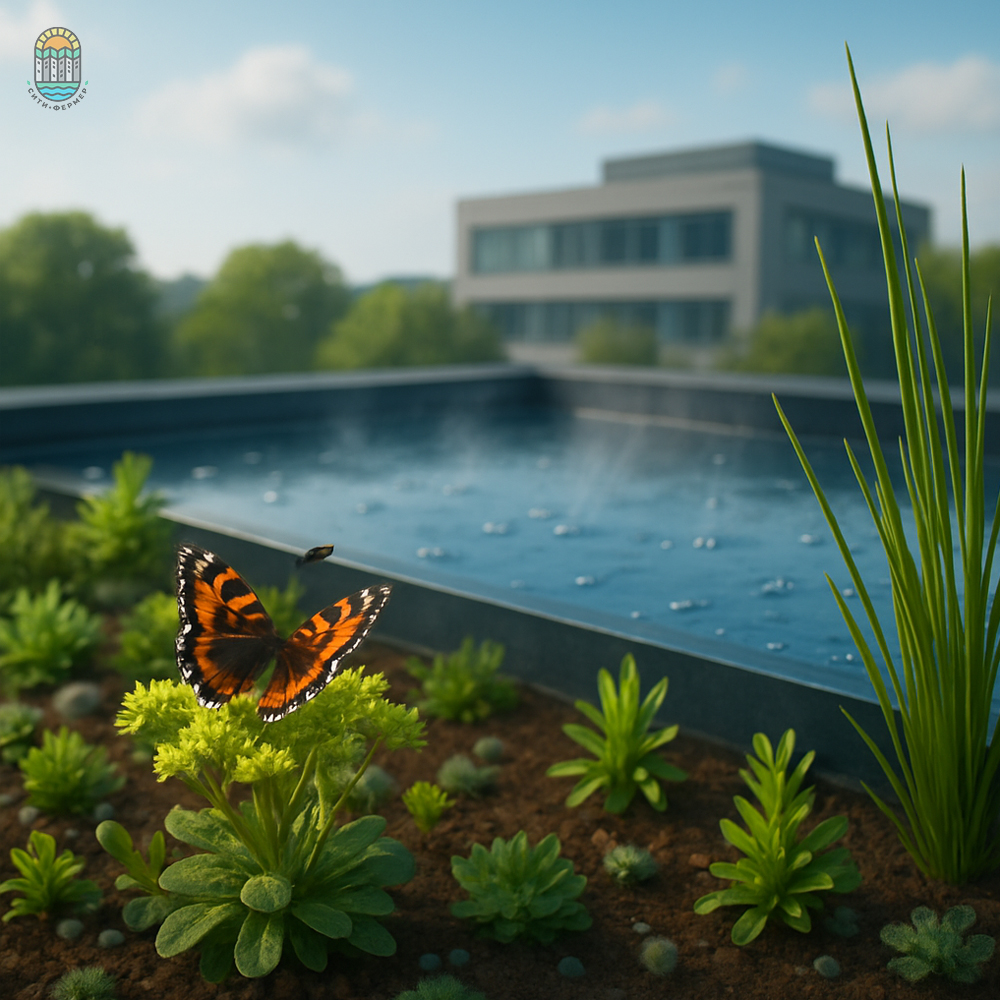 Сине-зелёная крыша — это миниатюрная экосистема. Когда идёт дождь, часть воды впитывается в субстрат, питая растения. Излишки стекают вниз — в водоудерживающий слой или систему резервуаров. Там они ждут своего часа.